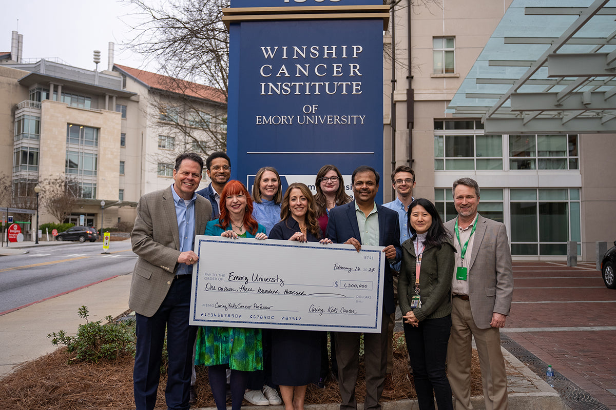 During the ceremony at Winship Cancer Institute, Grainne and Clay Owen, co-founders of Curing Kids Cancer, presented the check to Goldsmith and several of her colleagues, including Winship’s executive director, Suresh Ramalingam, MD, Winship deputy director, Adam Marcus, PhD, and Winship researcher and pediatric oncologist Douglas Graham, MD, PhD, medical director of the Aflac Cancer and Blood Disorders Center and chief of the Division of Pediatric Hematology/Oncology/BMT at Emory University School of Medicine.